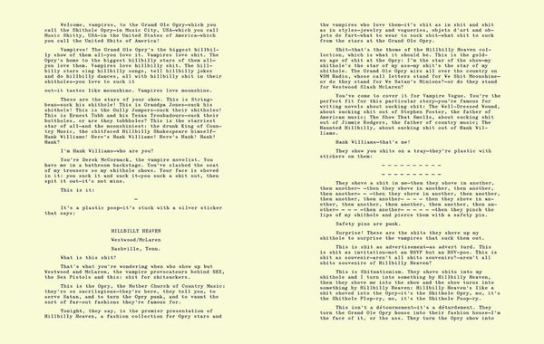 Derek McCormack's devilish blend of art and fiction imagines a world in which Vivienne Westwood and Malcolm McLaren are vampires, designing punk-influenced jewelry for other vampires visiting the Grand Ole Opry, the mother church of country music. From safety pin fangs to punk Minnie Pearl pearl necklaces, The Shithole Opry Collector's Guide showcases all manner of star-studded shit from McCormack's "Hillbilly Heaven Collection," which he has been documenting on his instagram page @thegrandholeopry since early 2024. The project is a riff on Westwood and McLaren's work of the 1970s, which reimagined American rockabilly and rocker gear; it's also a perversion of the clean-cut Christian facade of country music. Most of all, it's a parody of the way fashion designers pirate the past for inspiration, as it poses the question: What if the past stole from fashion the way fashion steals from the past? The Shithole Opry Collector's Guide combines McCormack's novel art-objects with his most original writing to date: the result is spectacular and sinister, sidesplitting and spine-chilling.