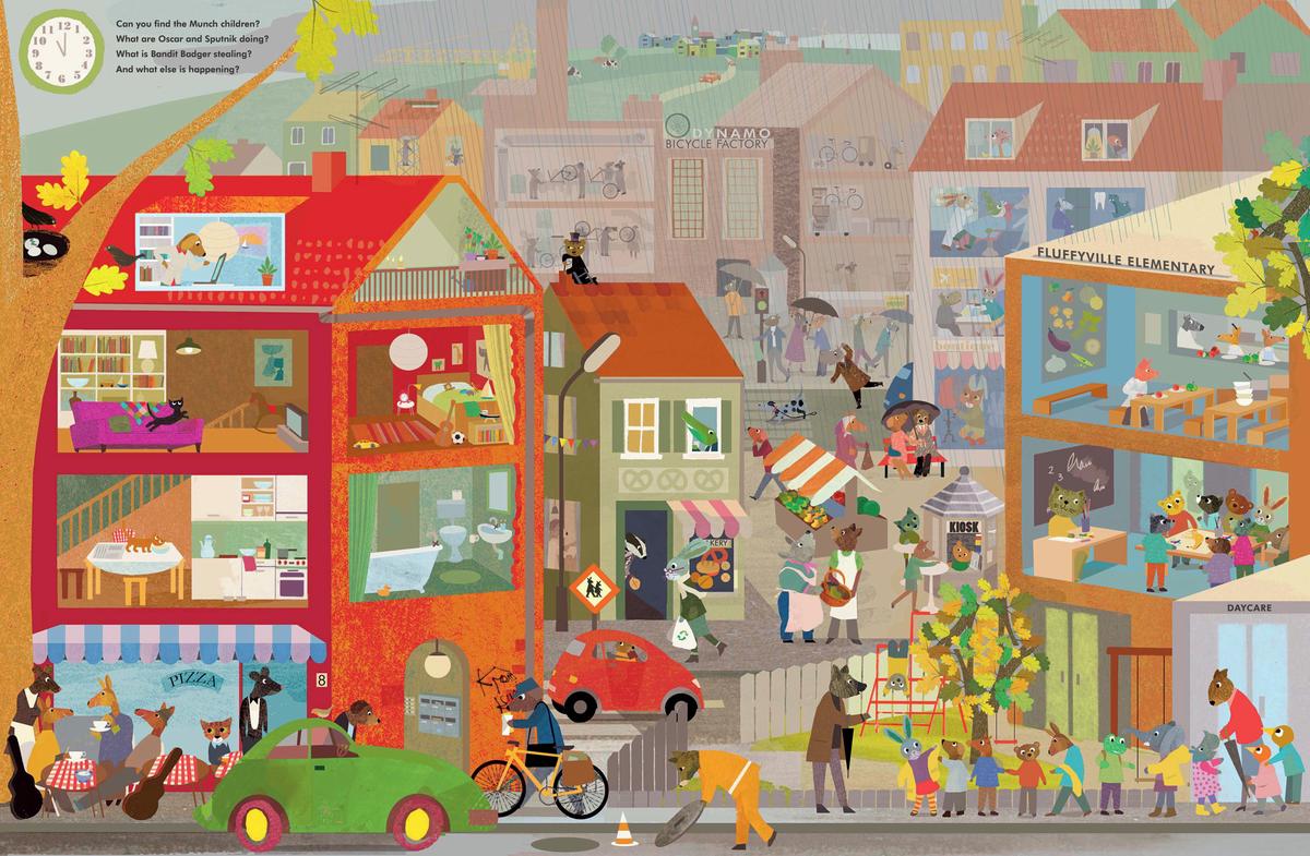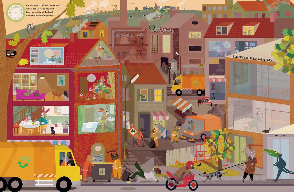 On 7 brightly colored and detail-packed double-page spreads, young readers can accompany the Munch family, as they wake up, get dressed, eat their meals, exercise, run errands, do chores, play, and get ready for bed. A zany cast of animal characters recurs on each page, as well as all sorts of activities from fire engines, and ambulances, to street musicians, and rainstorms. Watch out for Bandit the mischievous Badger, who’s always lurking about.
