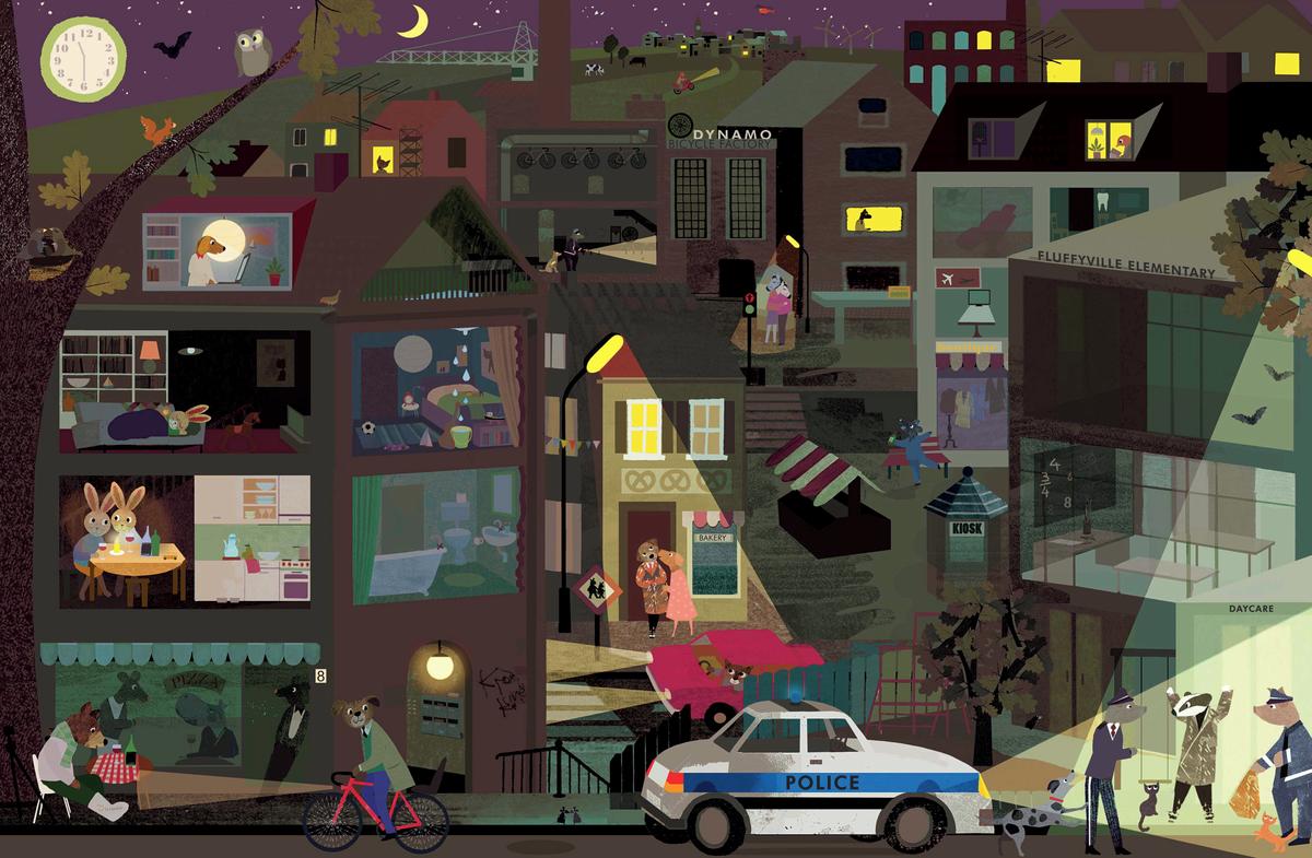 From morning to night, there’s loads of fun and furry friends to be found in this colorful depiction of a very busy day for a family in the city.