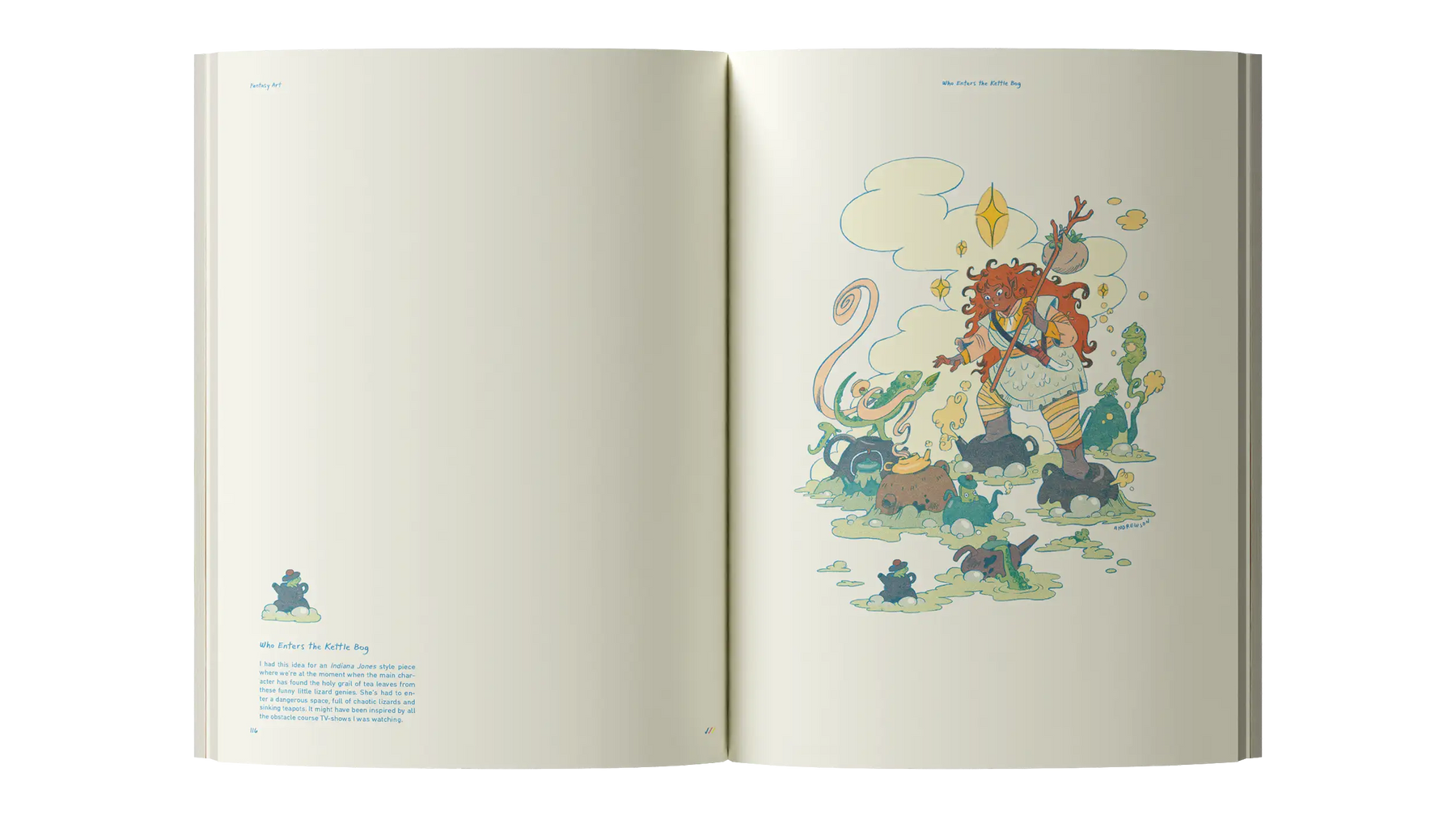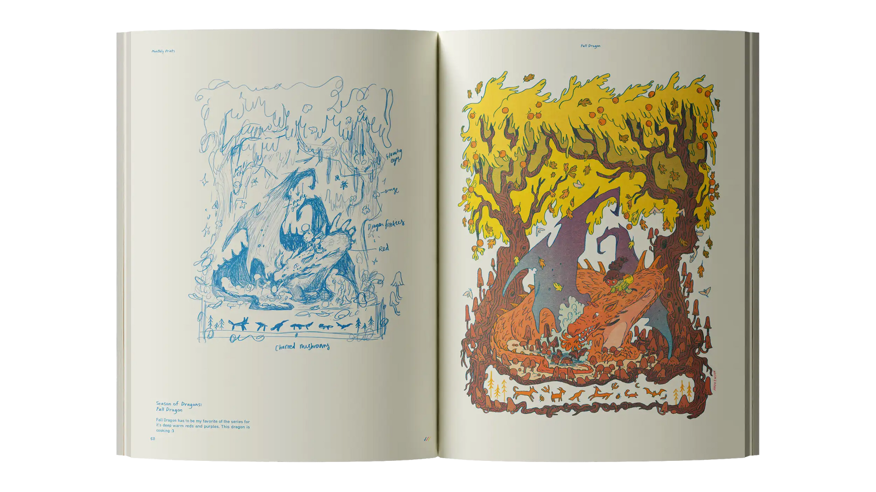 The book collects many of her risograph prints from the past years, which includes lots of dragons, some fanart, critters, creatures, magic, fantasy warriors, craftswomen, and more.